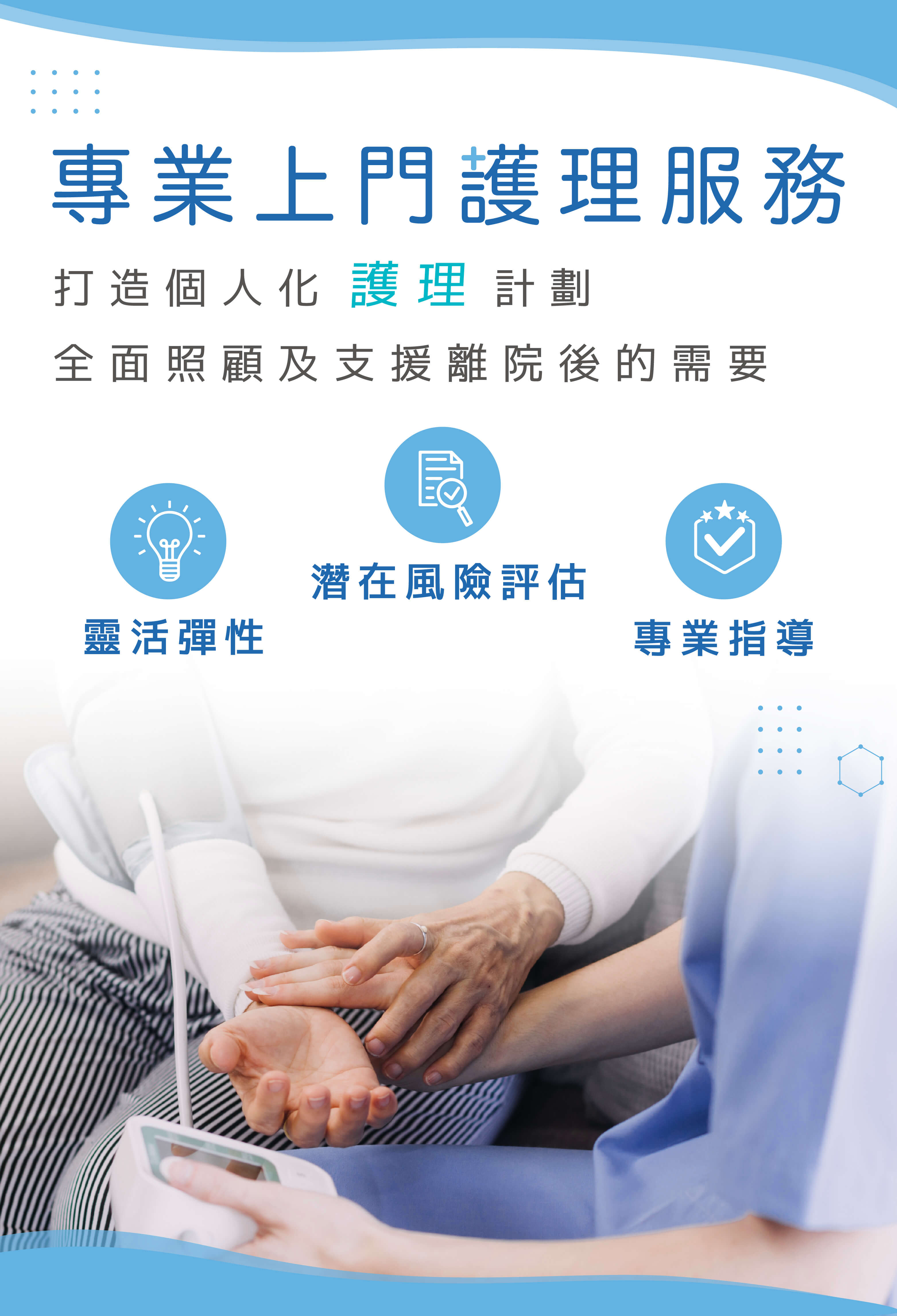 提供續後護理服務,按不同護理需要而作出調整,定時為長輩提供身體狀況評估,並作出相應的調整及處理,減低再入院次數。