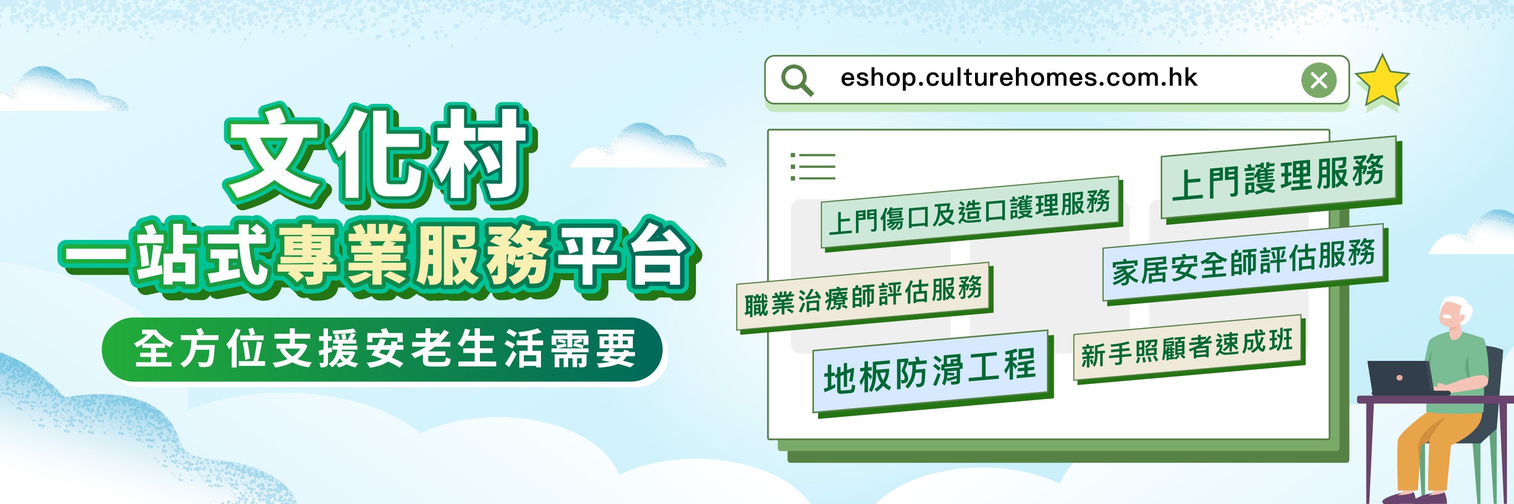 大部分的長輩都希望在熟悉的家中實行居家安老,而良好的居家安老生活需要各方面的配合。為陪伴著長者踏上居家安老的第一步,文化村特設一系列的專業服務,包括:上門傷口及造口護理服務、營養師諮詢服務、上門安裝扶手及沐浴椅服務、地板防滑工程、專業家居改善計劃、職業治療師上門評估、復康用品租賃服務等,全方位為照顧者及居家安老的家庭提供完善支援。